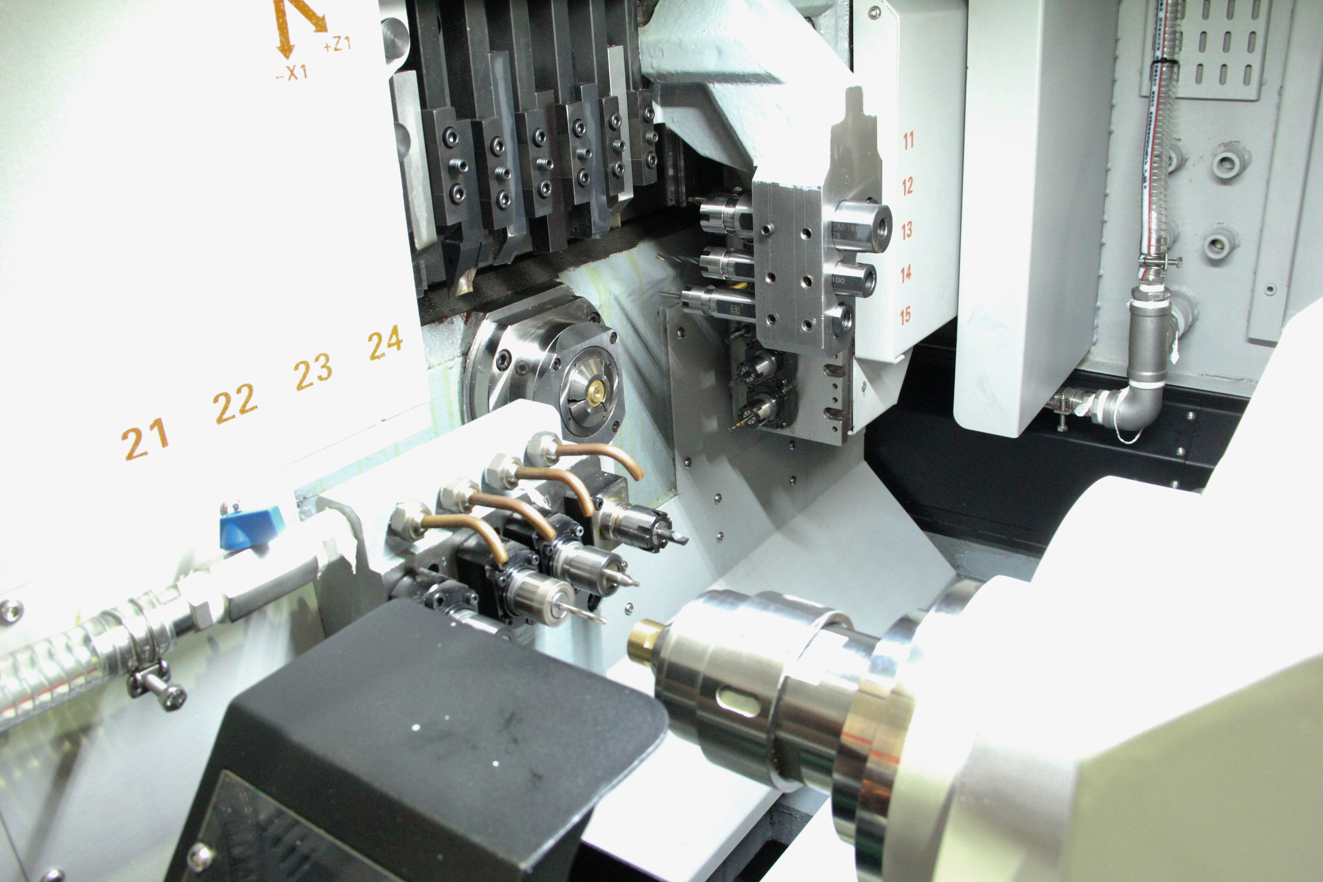 雙主軸走心機(jī)主/副軸標(biāo)配C軸任意分度定位,功能齊全不套路;主軸側(cè)面動力頭5孔位/副軸4孔位支持拔插拓展功能;標(biāo)配切斷檢測功能。